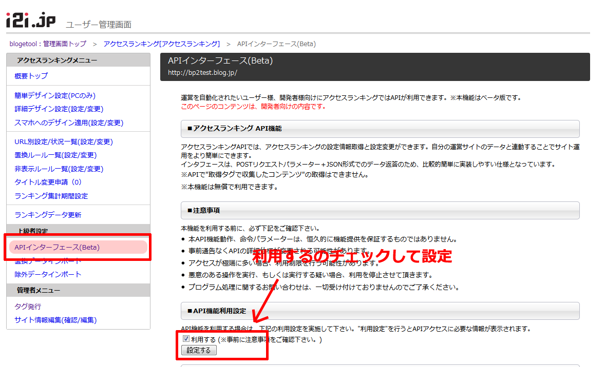 「APIインターフェース(Beta)」より、API機能利用設定を『利用する』にチェックを入れてください