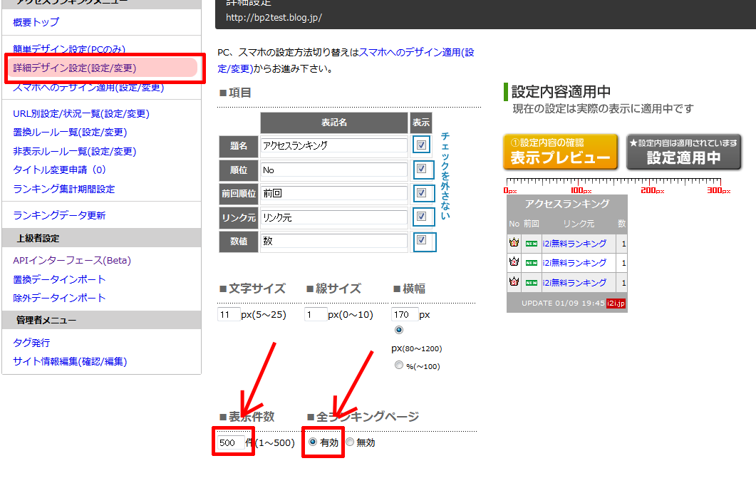 アクセスランキングの「詳細デザイン設定(設定/変更)」より、下記画像を参考に表示件数を『500』、全ランキングページ『有効』に設定して下さい